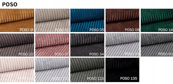 Diivanit katab pehme POSO laia triibuga velvetilaadne kangas, mis on topilisuse ja UV-kiirguse suhtes vastupidav. Kangast saab puhastada õrnade mööbliriietele mõeldud vahenditega.
