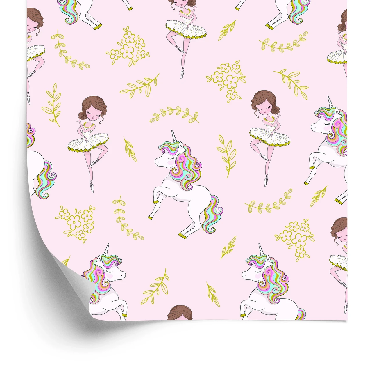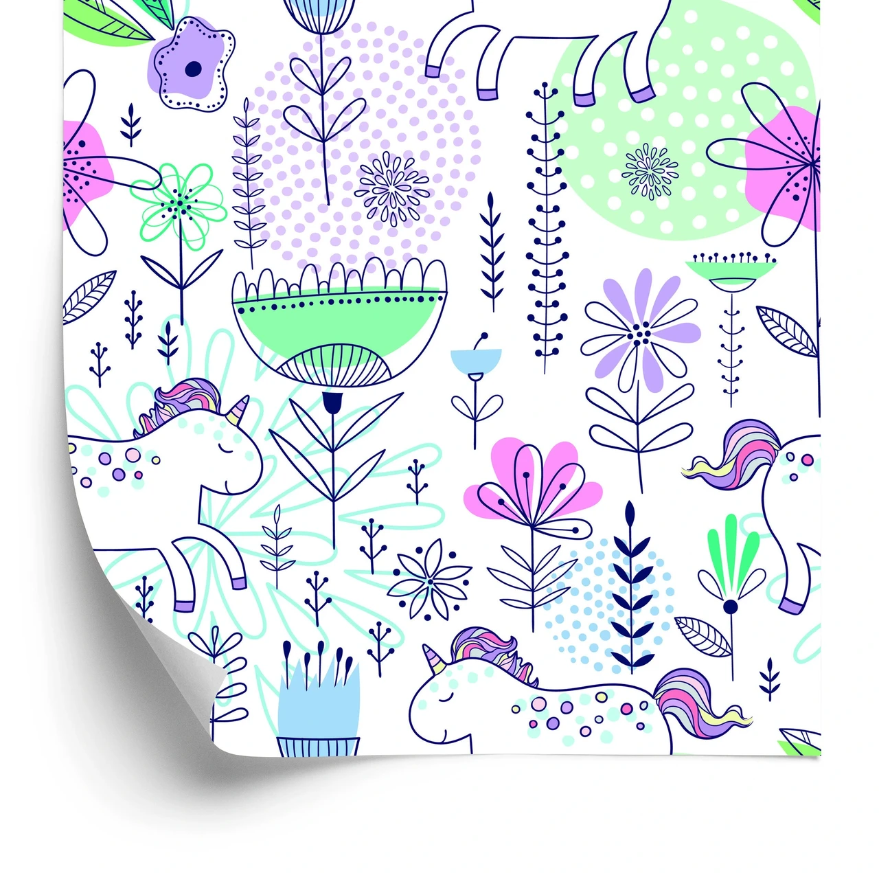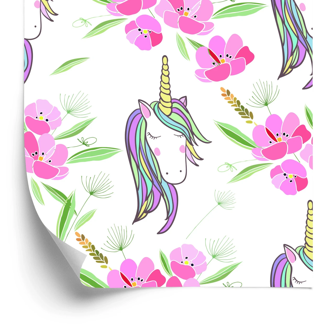 Laste fliistapeet Unicorns Flowers Leaves